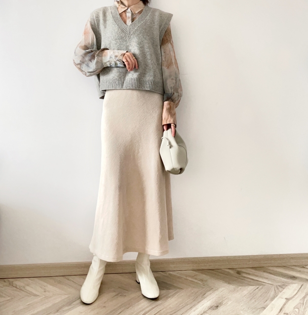 という方は、白いブラウスにスカートを合わせるのもおすすめです。明るい色というだけで、春らしく見えるので、多少素材が厚手でもOK。案外朝晩冷え込むこの時期に、オフホワイトのカーディガンや、白いコートは持っておくと安心なアイテムでもありますね。